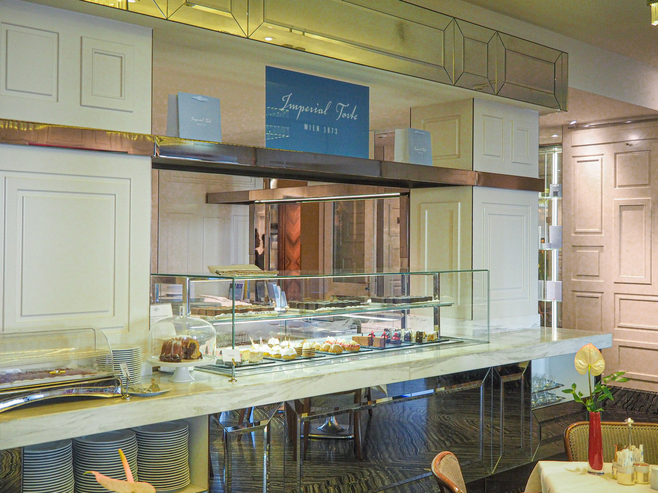 The café offers premium coffee, pastries, and traditional dishes like the famous Tafelspitz (boiled beef) and Wiener Schnitzel. Particularly famous here however is the Imperial Torte (cake) which consists of chocolate buttercream, thinly sliced almonds and marzipan all topped with a chocolate icing. The cake looks slightly similar to the famous Sacher Cake also it is shaped as a square and the filling is different. The cake was created in occasion of the opening of Hotel Imperial in 1873 in honour of Emperor Franz Joseph I.