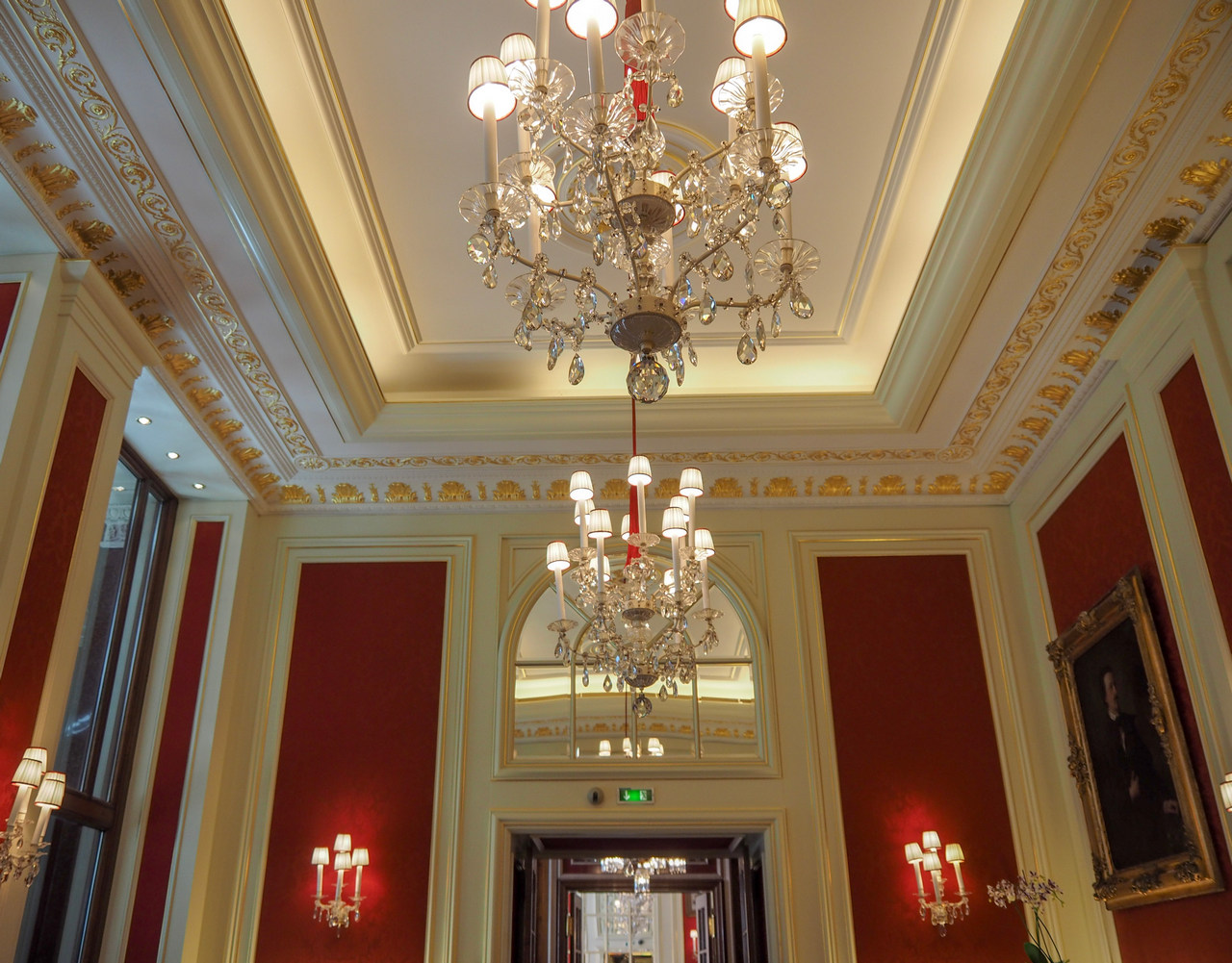 The beautifully restored interior dates to the turn of the century, featuring dark wood panelling, stucco-decorated high ceilings and glass chandeliers.