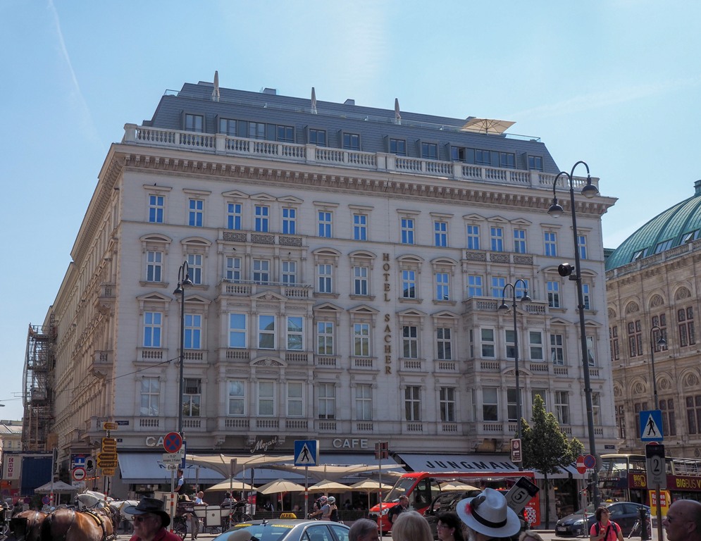 Café Sacher, which was founded by Franz’s son Eduard in 1876, is located inside Hotel Sacher just across the state opera in the centre of Vienna, only a short walk from Karlsplatz station. The café is almost impossible to miss with typically a large line forming at the entrance.